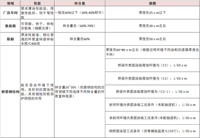 二、在應(yīng)用不同領(lǐng)域中,適用的環(huán)氧富鋅底漆鋅含量參數(shù)(僅供參考):